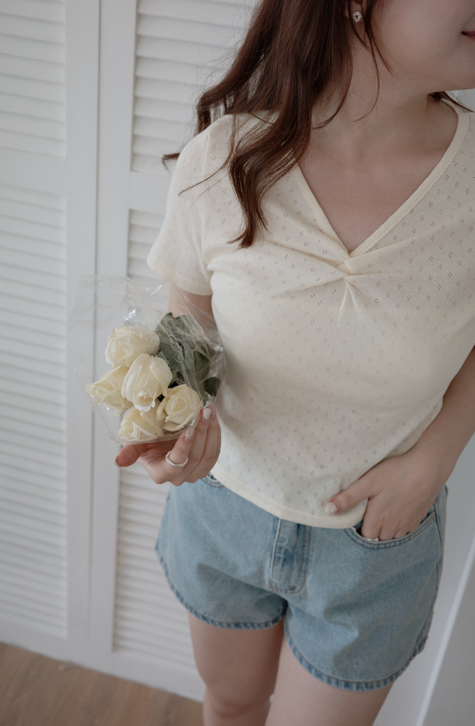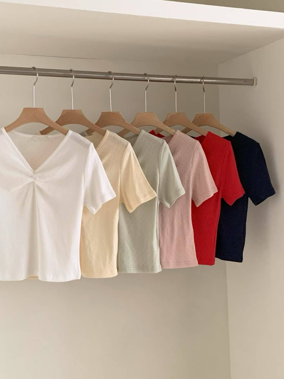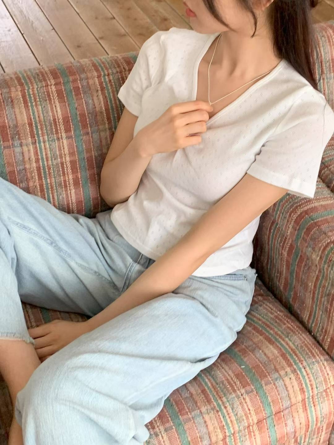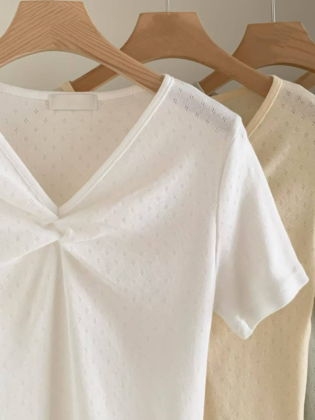 包色~小V領鏤空柔棉上衣
